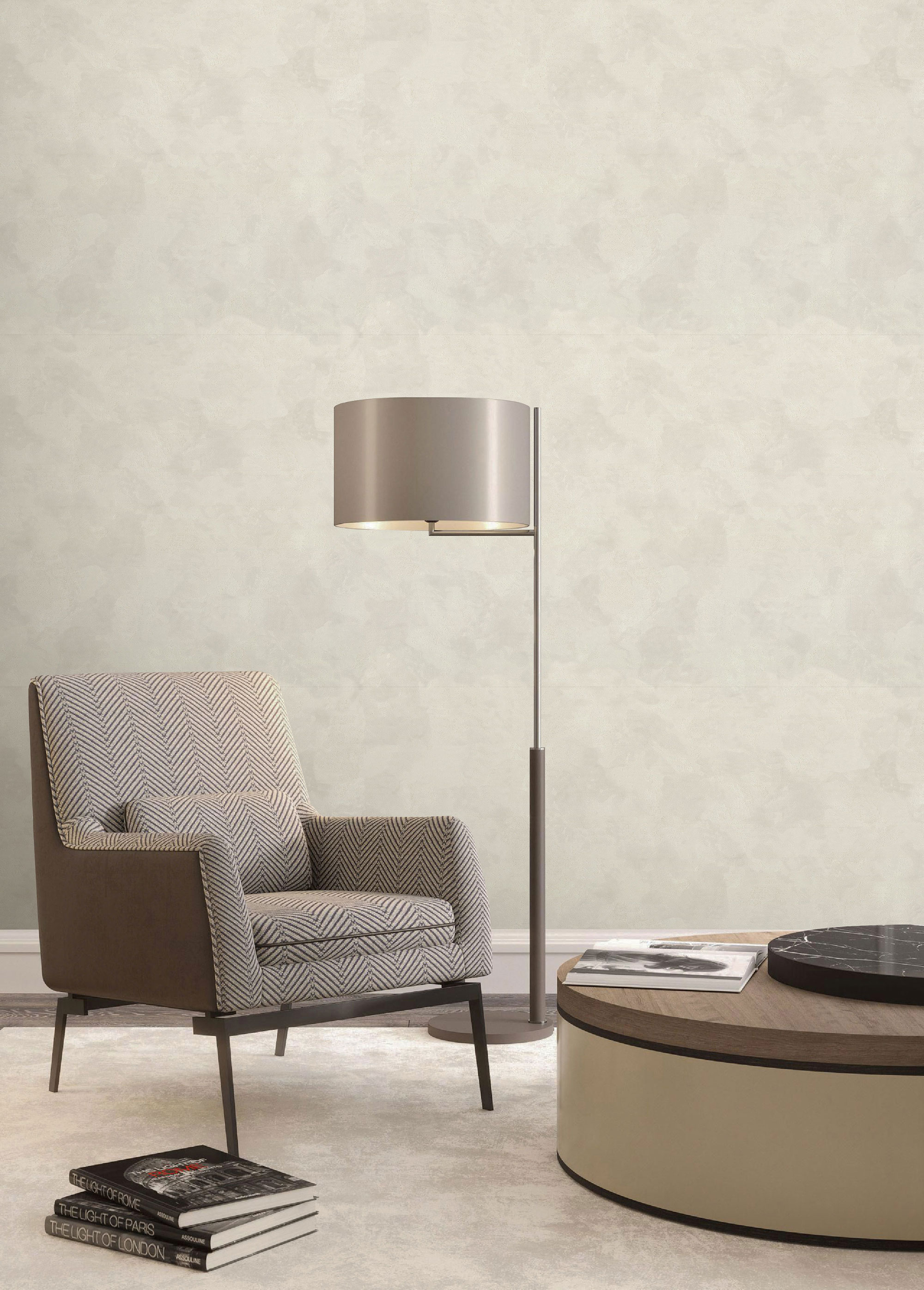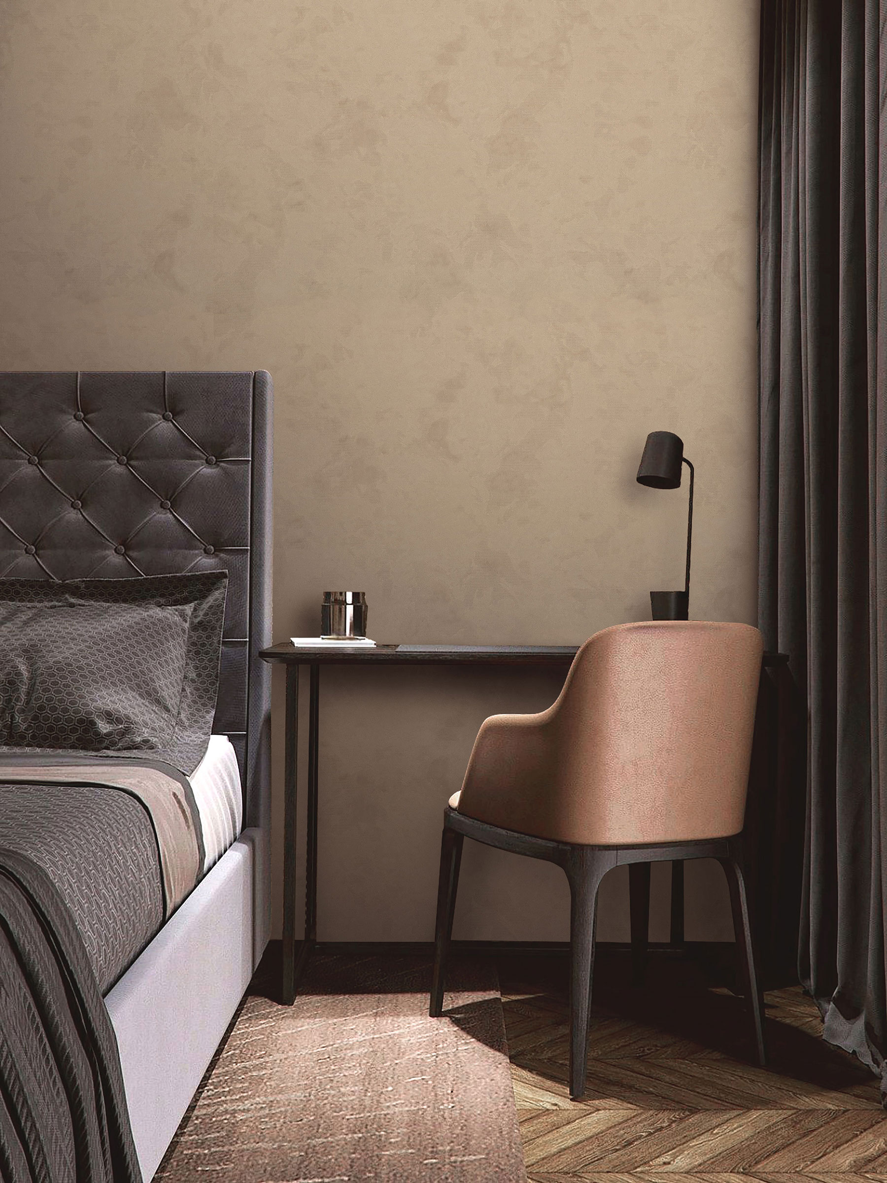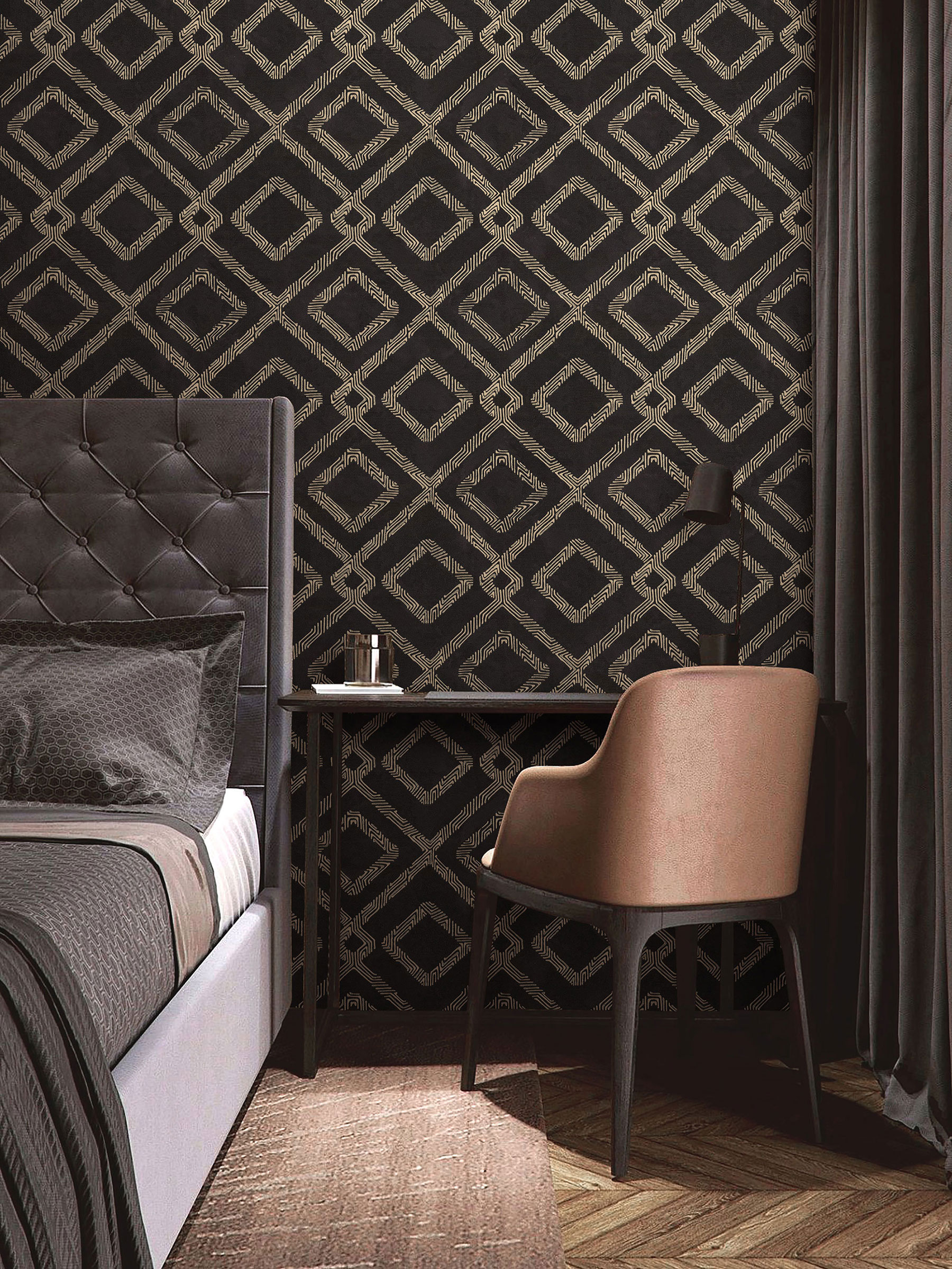 Акцентом мотива выступает геометрический узор, основу которого составляют ромбы крупных и малых размеров. Они образуются из рельефных линий разной длины, формы и направления, которые создают дополнительный орнамент. Наложение крупного глиттера на некоторые полосы добавляют ослепительного блеска, а контрастный контур и металлик, которым выделены большинство линий, делают полотно ярким и объемным. Фон коллекции “Frame”, как и задний план мотива, представлен в спокойных тонах с шероховатой текстурой, имитирующей штукатурку. Темные участки, аккуратное наложение спецэффектов, активное разностороннее тиснение деликатно проявляют его фактуру. Фон гармонично дополняет и поддерживает яркий узор мотива.
