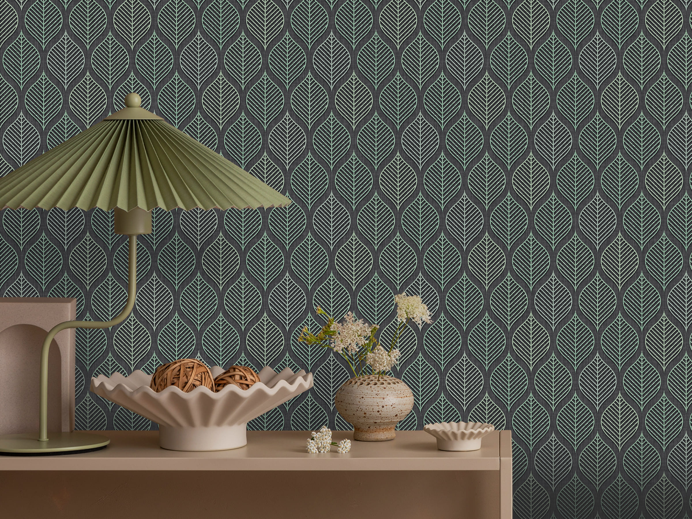 Изящная графика с четкими рельефными контурами листьев создает поистине завораживающую игру света и тени. Листики будто вышиты металлизированной нитью на матовом текстильном фоне. Они создают объемный тактильный рисунок, который хочется потрогать.