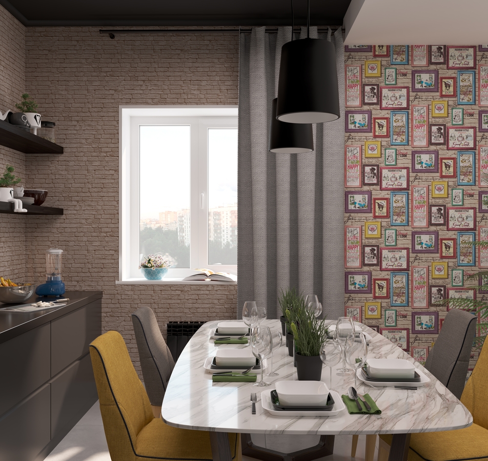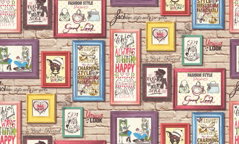 Ассоциации. Разноцветные рамки с графичными картинками похожи на причудливую мозаику. Подборка креативных надписей придает обоям уникальный стиль. Фон в виде крашенных кирпичей добавит в интерьер нотку индивидуальности.
