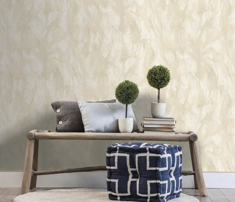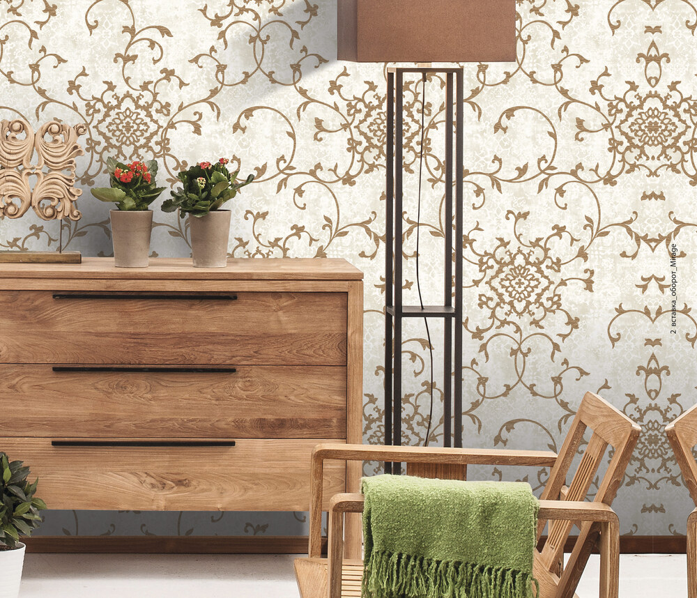 Изящный растительный узор с плавными, естественными изгибами в сочетании с рельефной фактурой и мелким шиммером, создают непрерывный рисунок, в котором одна линия изысканно соединяется с другой, создавая при этом ощущение воздушности и легкости, что привнесет в ваш интерьер элемент классики и традиционности.