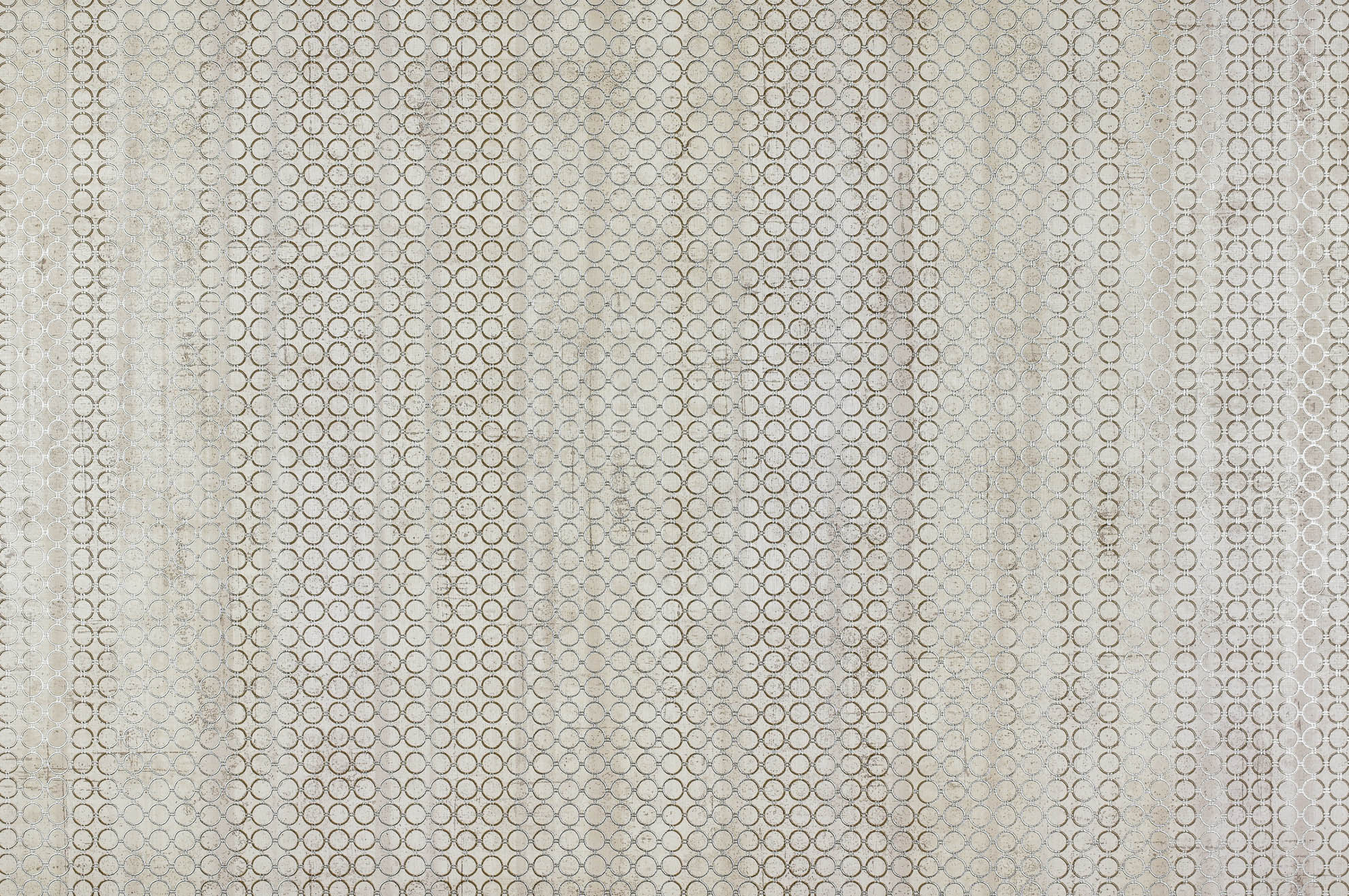 Сплетение металлических колец скрывает грубую фактуру бетонной стены, делая намёк на гламурный шик. Сдержанные брутальные колористики подчёркивают современность и оригинальность коллекции. Фон-компаньон самодостаточен и может использоваться отдельно. Его реалистичная матовая текстура идеальна для классического лофтового дизайна.
