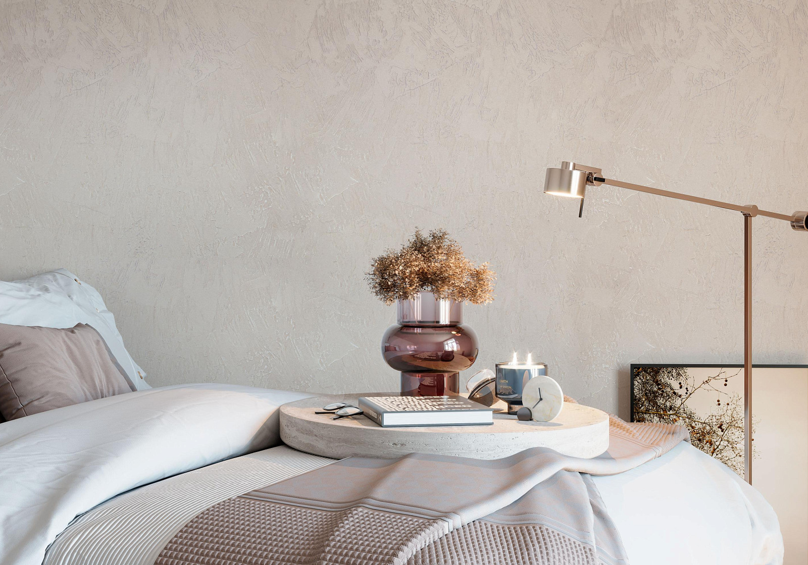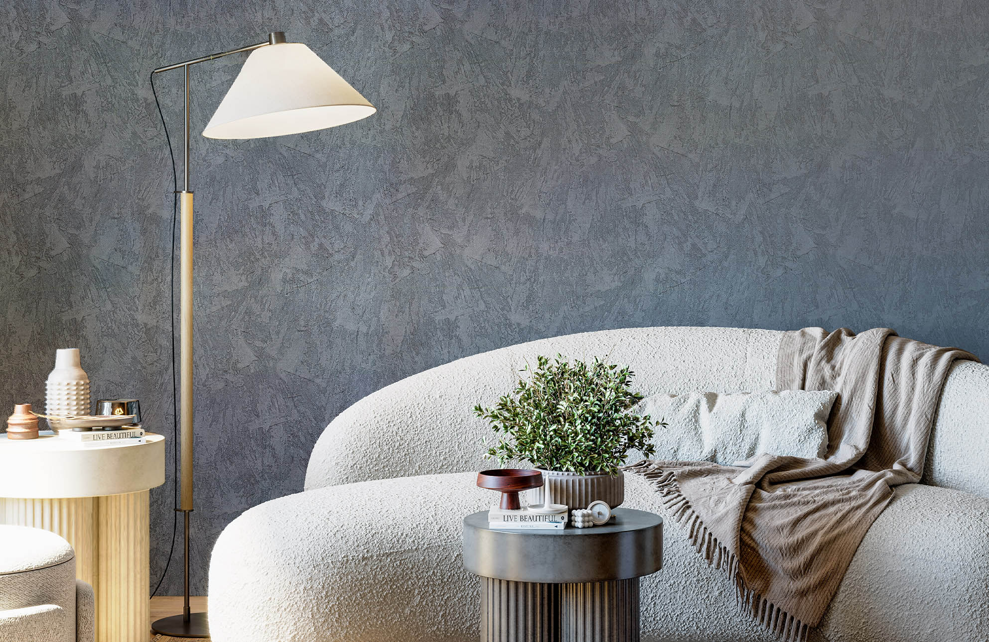 Поверхность обоев реалистично имитирует венецианскую штукатурку, нанесенную в технике «драпе». Широкие мазки создают на стене уникальный рисунок. Его приятная на ощупь поверхность чередует рельефные и гладкие участки, как в настоящей штукатурке.