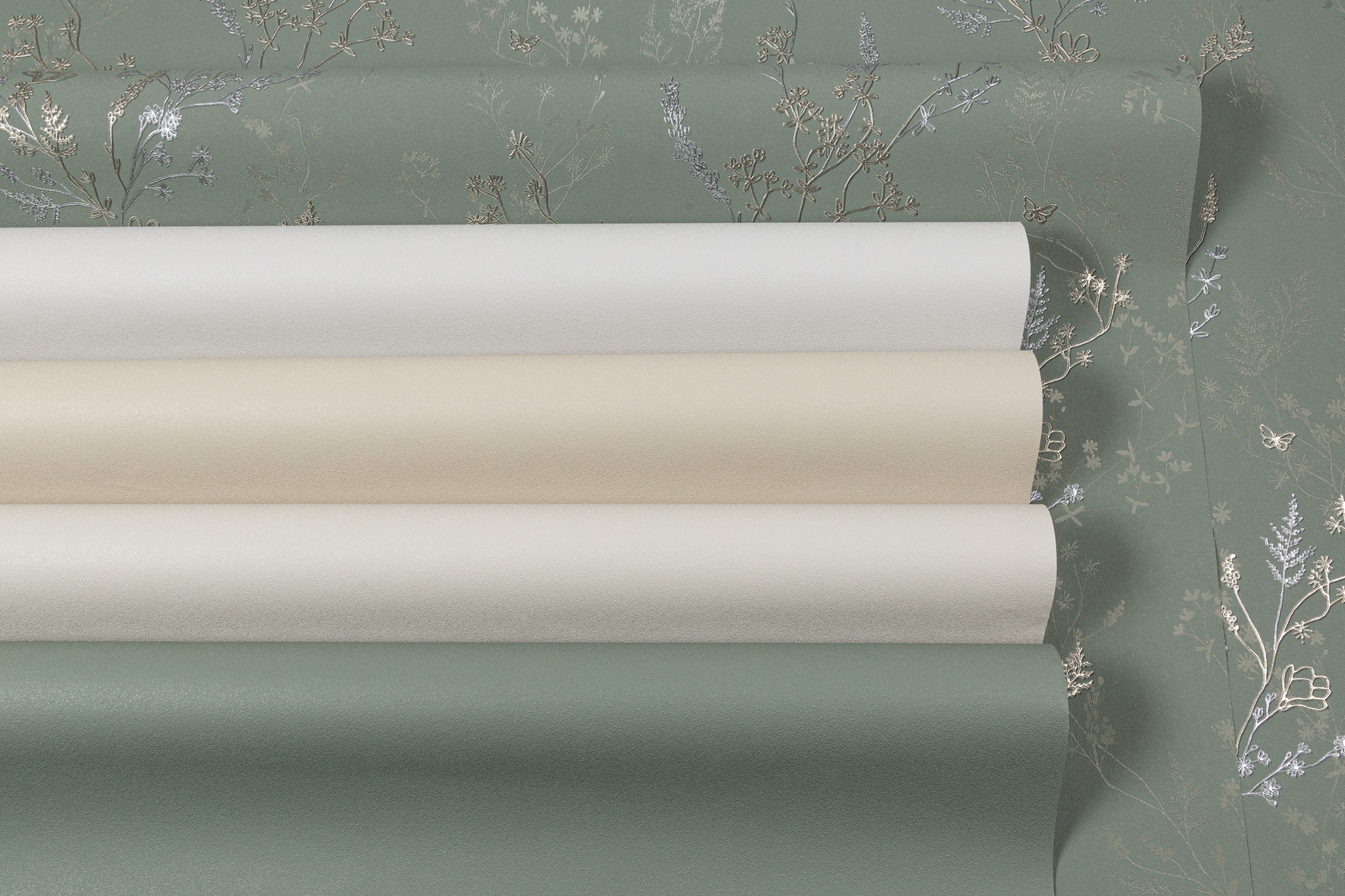 Игра рельефа на свету создает зеркальный эффект на основном мотиве. Благодаря разноуровневому тиснению дублирующие силуэты травинок и цветов, словно тень, уходят на задний план, визуально расширяя пространство.