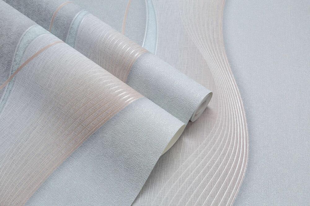 Мягкое переплетение волн египетского хлопка и блестящих, глянцевых лент образует основной мотив обоев. Его дополняет чередование плавной тени и мерцающих песчинок, отчего создается ощущение объема.