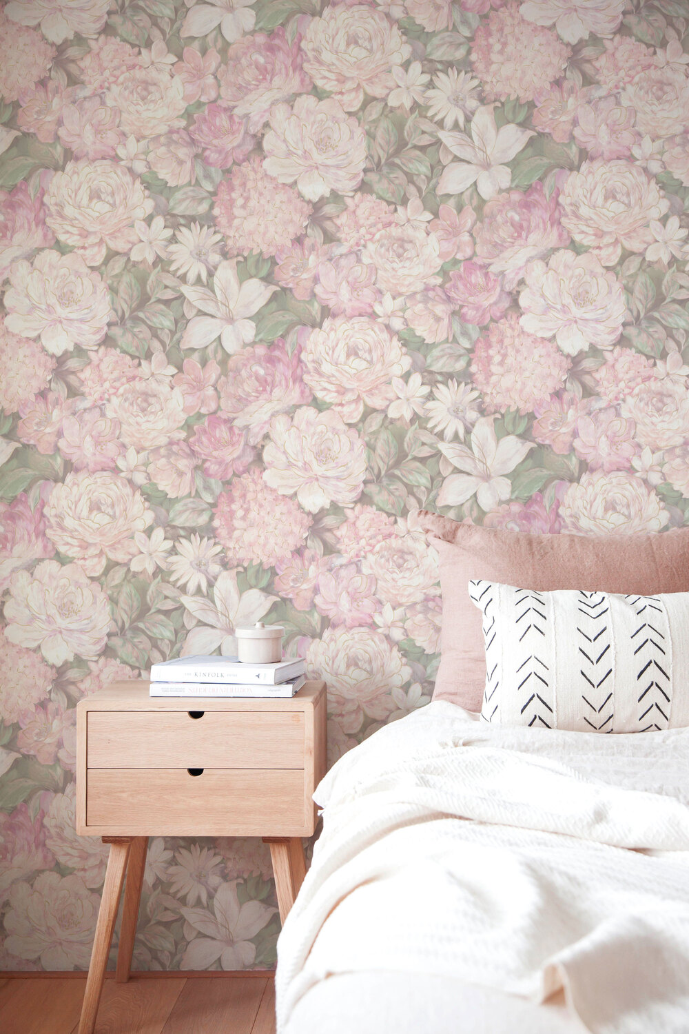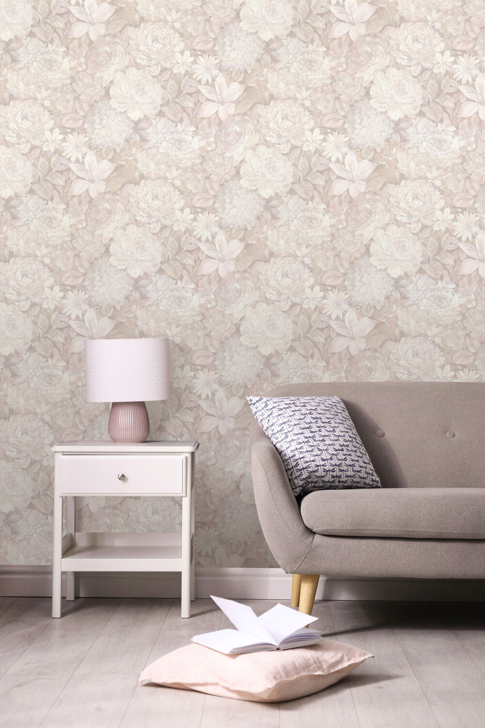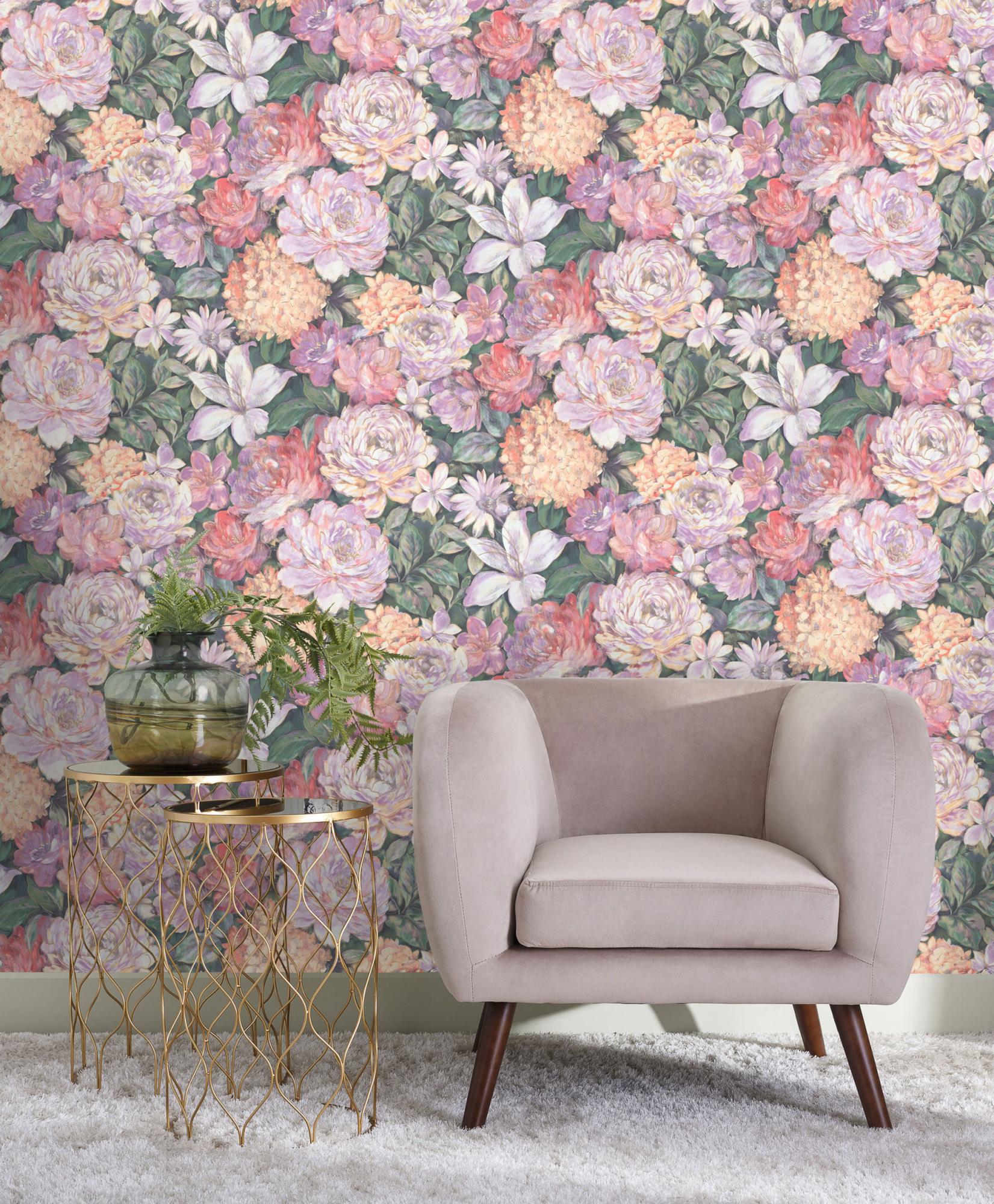 Текстильный фон коллекции спокойный, разнообразная текстура с наличием тех же блесток, что и на цветках, гармонично дополняет основной мотив и эффектно подчеркивает его. Женственная коллекция обоев Miranda создана, чтобы привносить в интерьер радость и безмятежность цветущего сада.