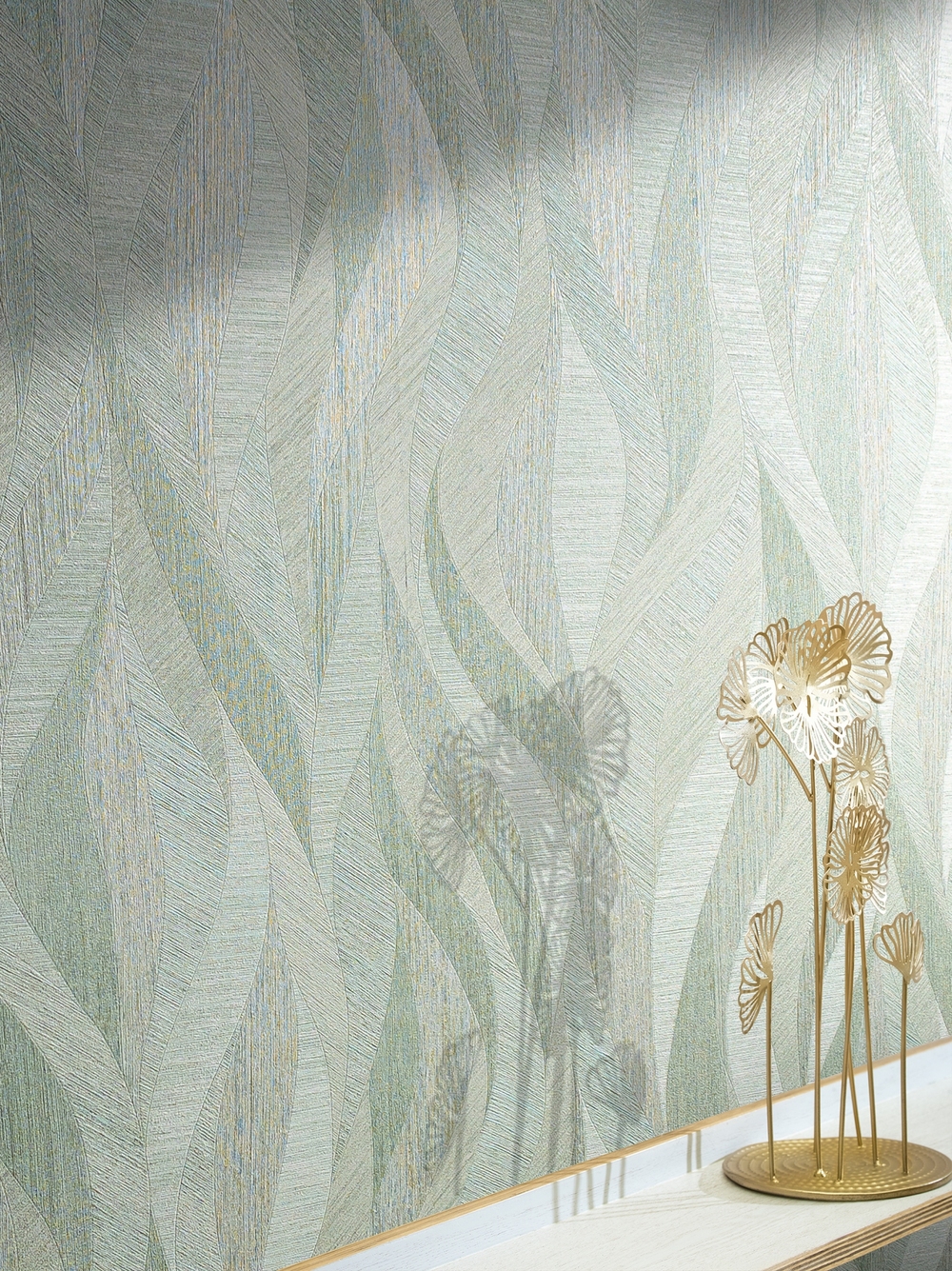 Коллекция получилась с акцентом на естественность, но с добавлением гламурного шика. Пальмовые абстрактные листья, сквозь которые просачиваются теплые солнечные лучи, создают эффект золотого сияния, наполняя комнату светом и уютом.