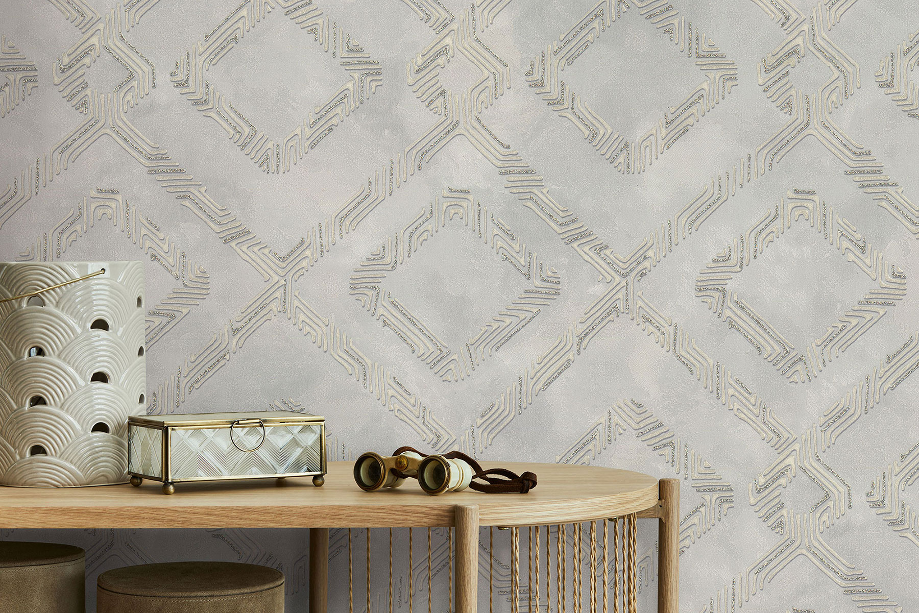 Акцентом мотива выступает геометрический узор, основу которого составляют ромбы крупных и малых размеров. Они образуются из рельефных линий разной длины, формы и направления, которые создают дополнительный орнамент. Наложение крупного глиттера на некоторые полосы добавляют ослепительного блеска, а контрастный контур и металлик, которым выделены большинство линий, делают полотно ярким и объемным. Фон коллекции “Frame”, как и задний план мотива, представлен в спокойных тонах с шероховатой текстурой, имитирующей штукатурку. Темные участки, аккуратное наложение спецэффектов, активное разностороннее тиснение деликатно проявляют его фактуру. Фон гармонично дополняет и поддерживает яркий узор мотива.