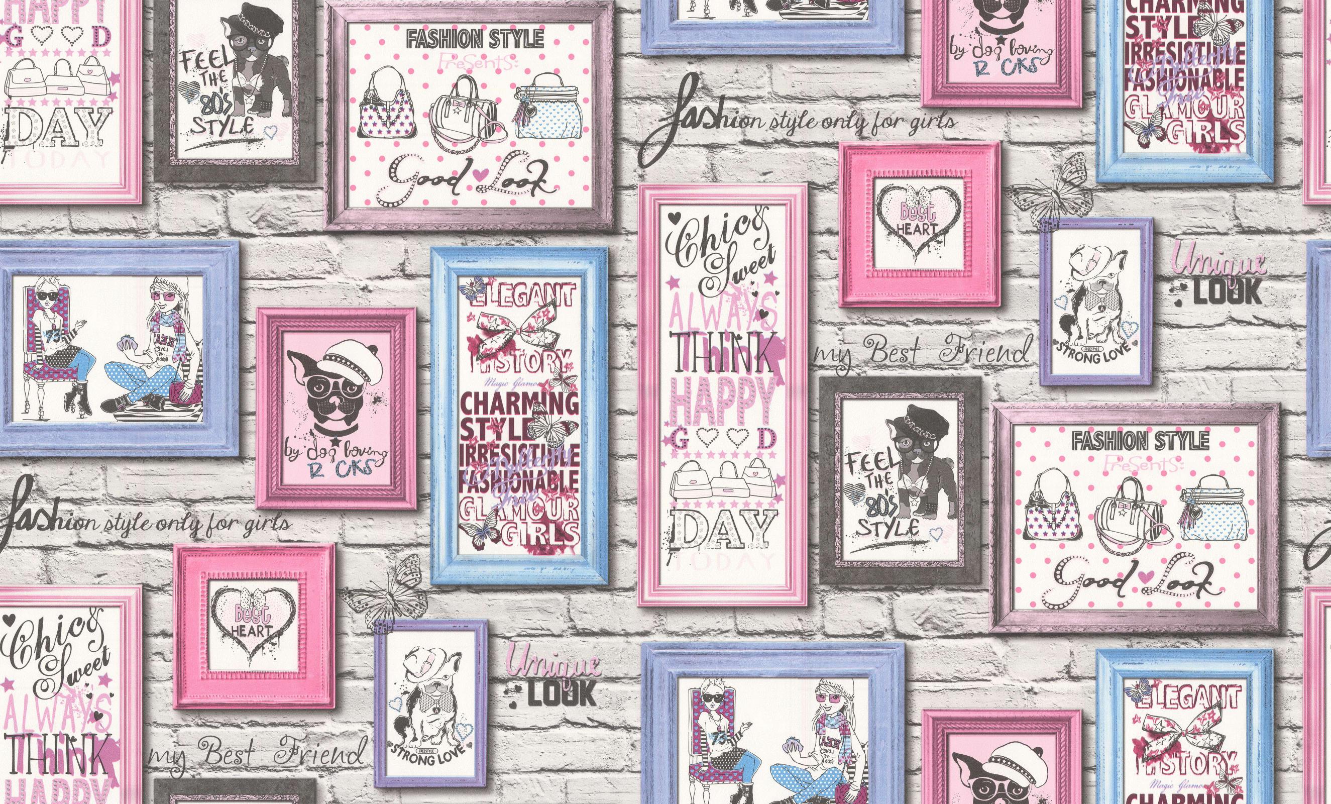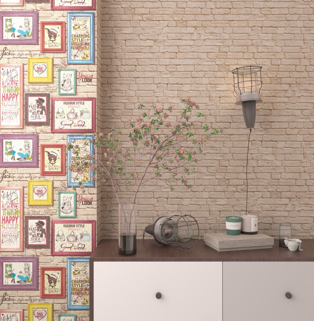 Ассоциации. Разноцветные рамки с графичными картинками похожи на причудливую мозаику. Подборка креативных надписей придает обоям уникальный стиль. Фон в виде крашенных кирпичей добавит в интерьер нотку индивидуальности.