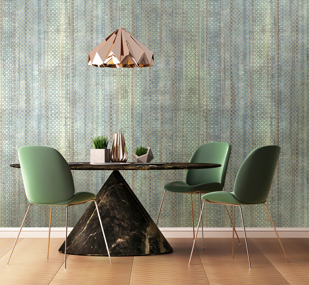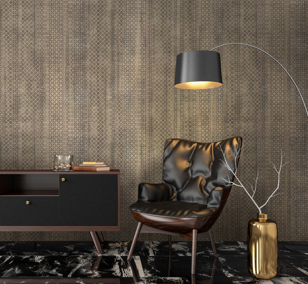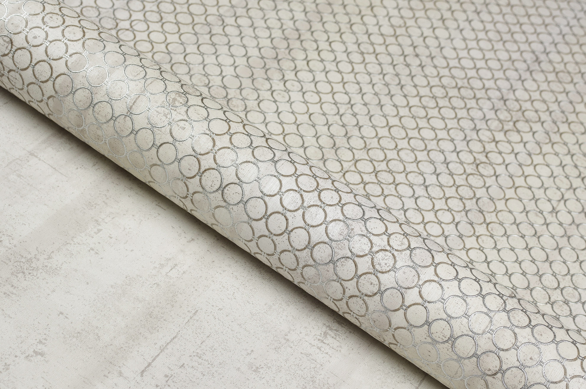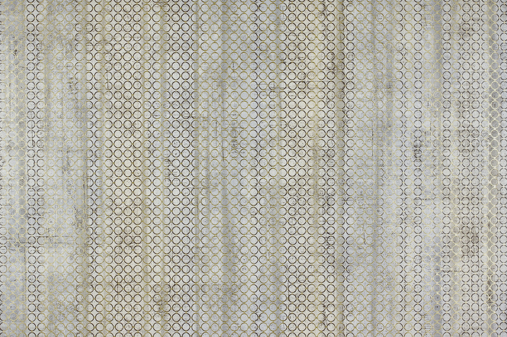 Сплетение металлических колец скрывает грубую фактуру бетонной стены, делая намёк на гламурный шик. Сдержанные брутальные колористики подчёркивают современность и оригинальность коллекции. Фон-компаньон самодостаточен и может использоваться отдельно. Его реалистичная матовая текстура идеальна для классического лофтового дизайна.