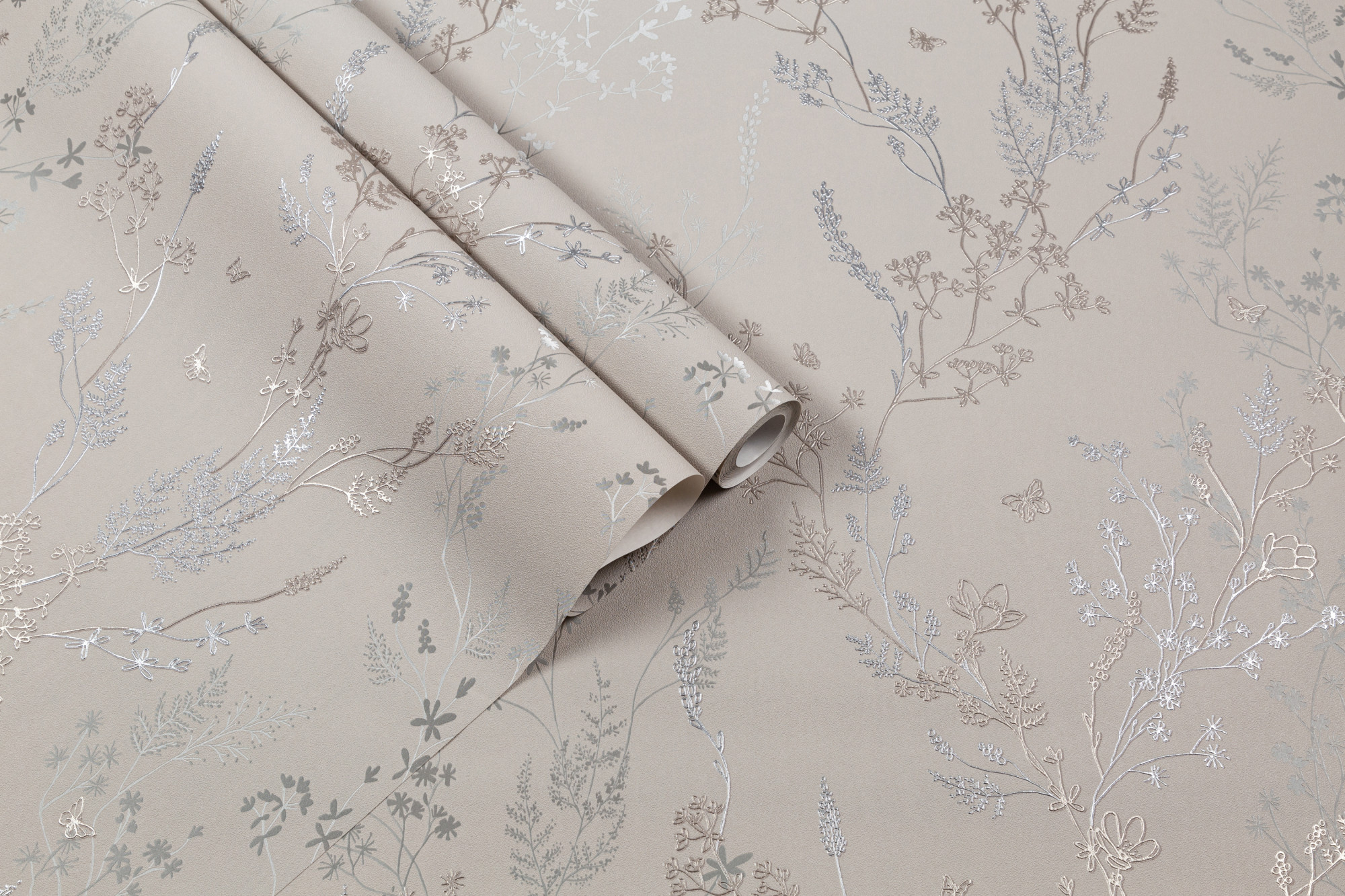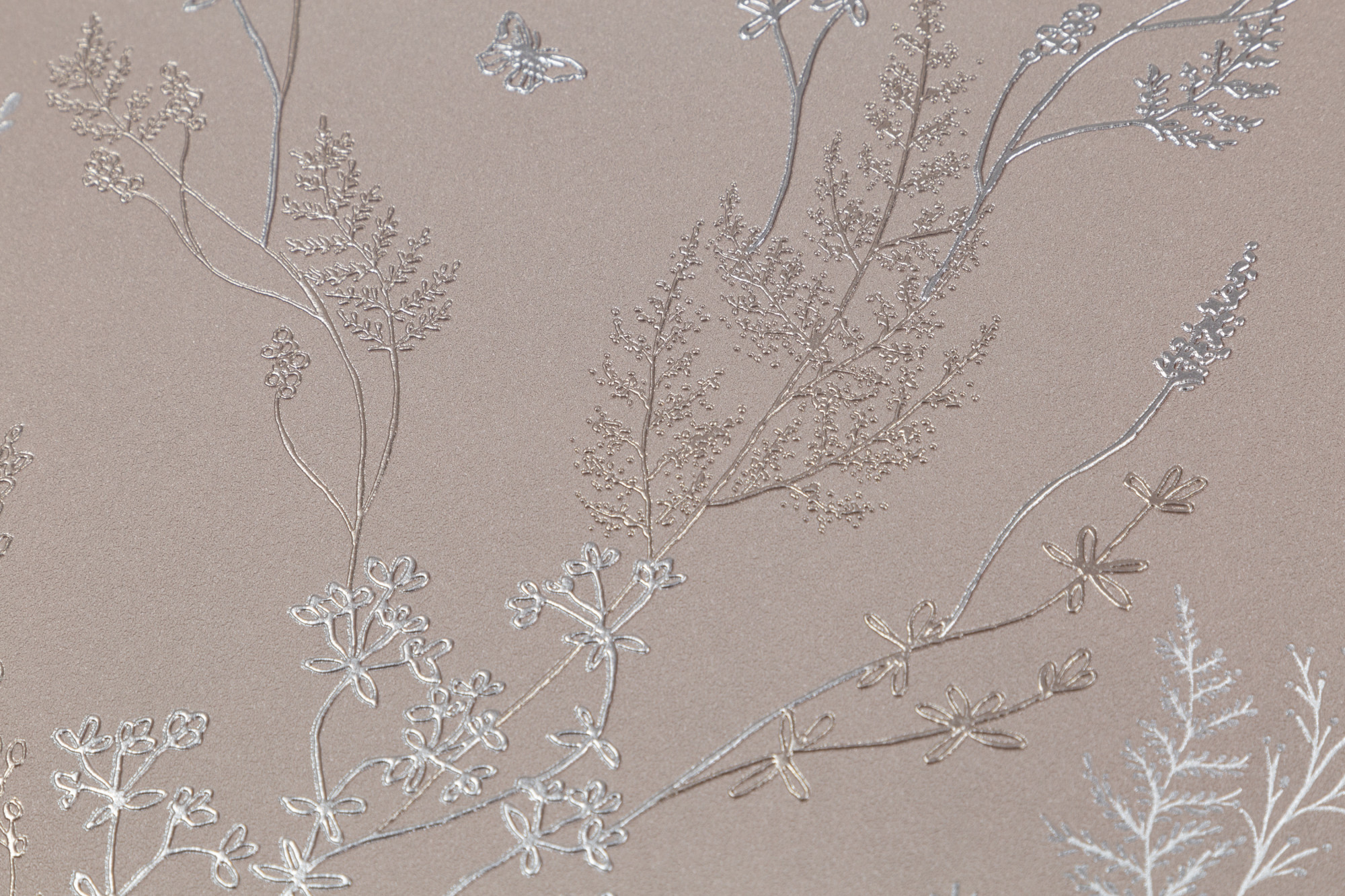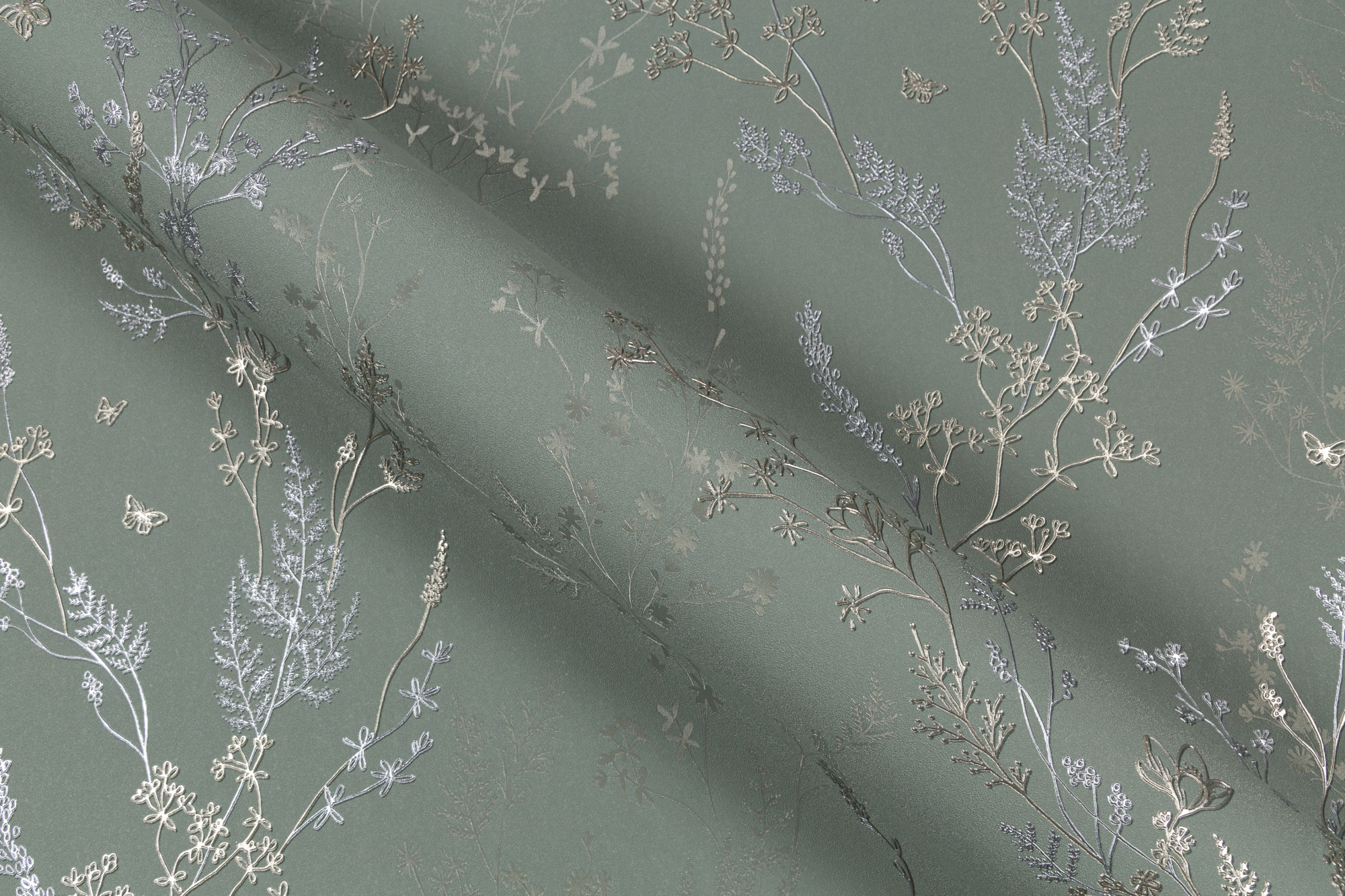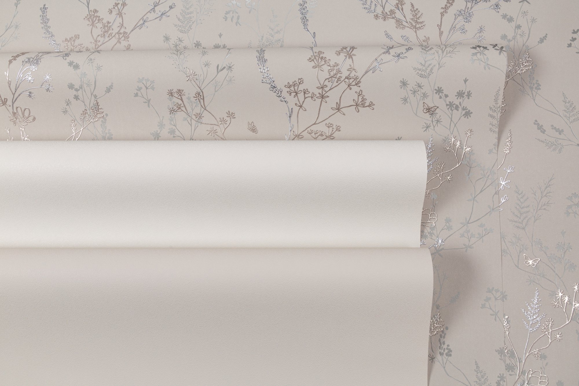 Игра рельефа на свету создает зеркальный эффект на основном мотиве. Благодаря разноуровневому тиснению дублирующие силуэты травинок и цветов, словно тень, уходят на задний план, визуально расширяя пространство.