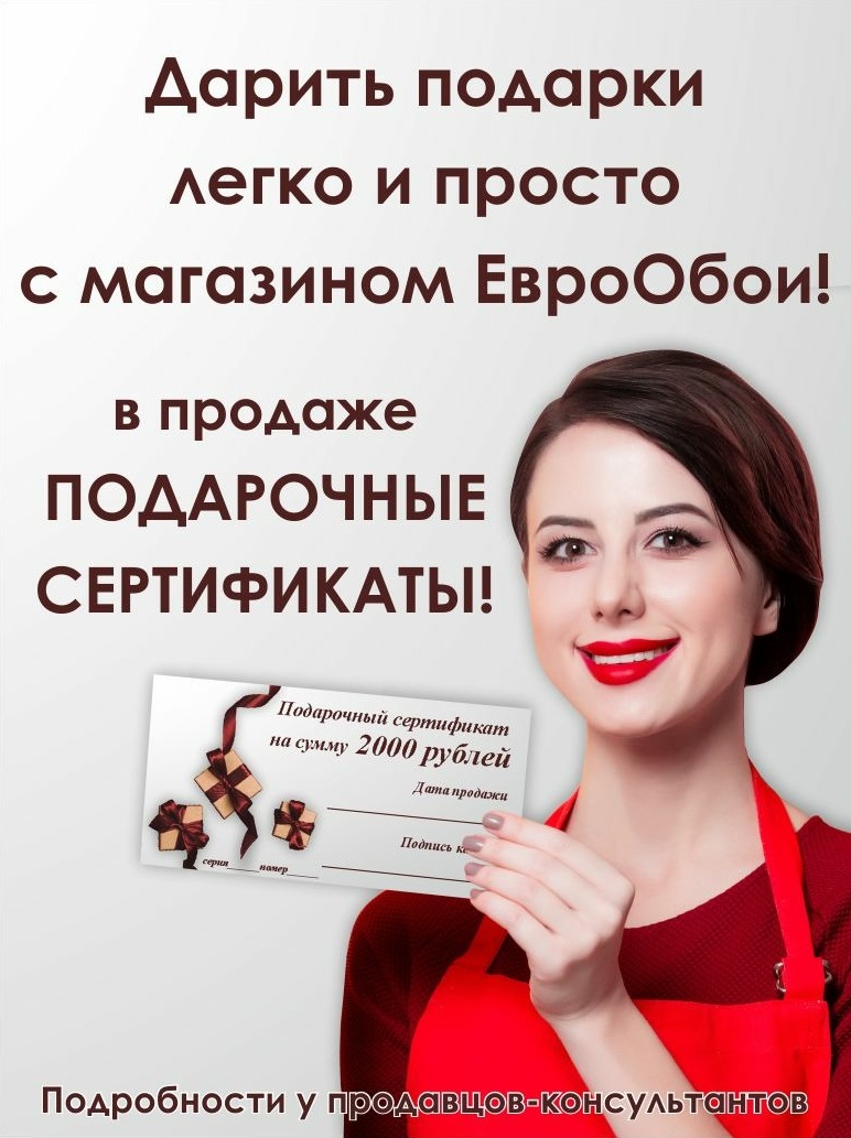 В салонах "Евро Обои" Вы сможете приобрести подарочные сертификаты номиналом 2000, 3000, 5000 и 7000 рублей!