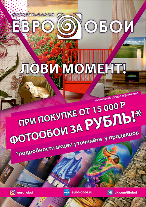 При покупке от 15000 руб фотообои всего за 1руб!